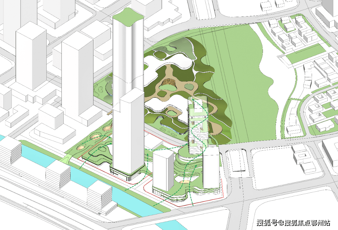 商业空间以曲线型的绿色山谷为意向,与滨河空间连成一体,绿化自河岸沿建筑层层生长,漫过裙房、170米塔楼,与中央公园遥相呼应。
